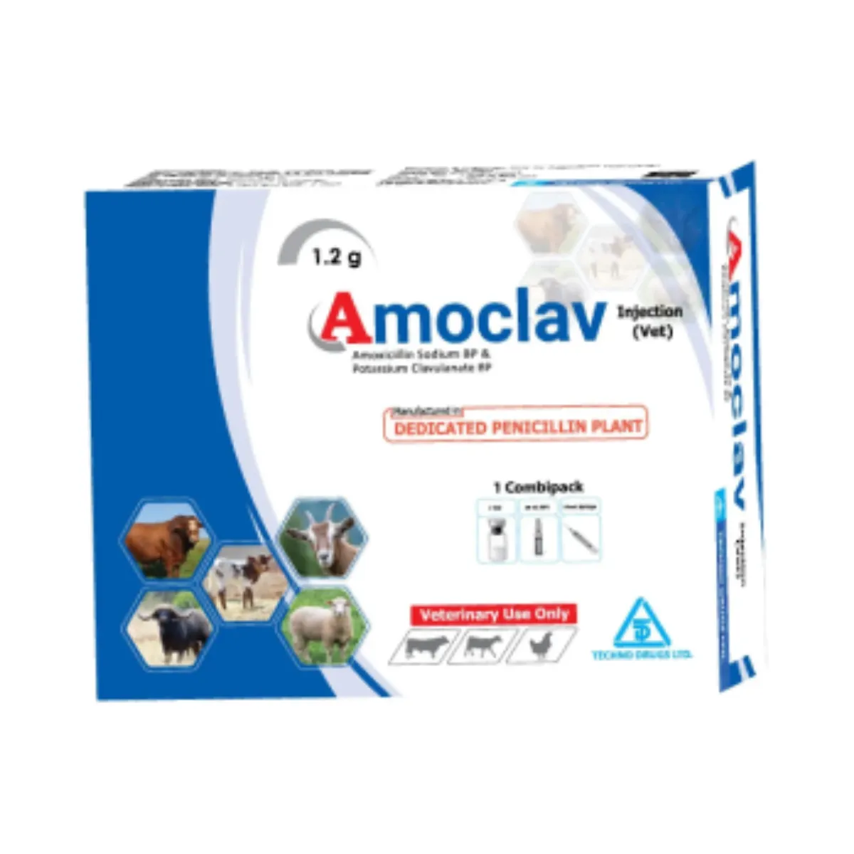 Amoclav 1.2 Injection is an antibacterial combination containing the antibiotic Amoxicillin and the β-lactamase inhibitor Clavulanic Acid. Amoxicillin gives broad-spectrum bactericidal activity, and Clavulanic acid inactivates β-lactamases, which are the main avenue of resistance by bacteria to β-lactam antibiotics such as Amoxicillin. Together, this combination extends the effective antibiotic spectrum of Amoxicillin.